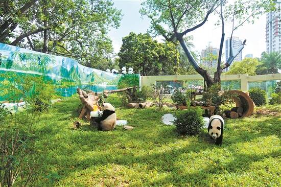 在室外讲理玩耍的“久久”“友友” 羊城晚报记者 陈秋明 摄