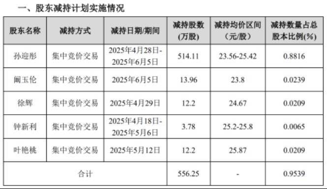 减握公告表露,2025年4月29日至6月5日历间,公司董事长孙迎彤、董事、副总司理阚玉伦等五位高管均在减握公司股份,所有减握公司556.56万股股份。其中,董事长孙迎彤减握比例最高,共减握514.11万股,减握比例为0.88%。经狡计,孙迎彤本轮减握套现款额上限为1.31亿元。