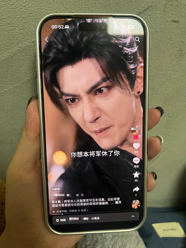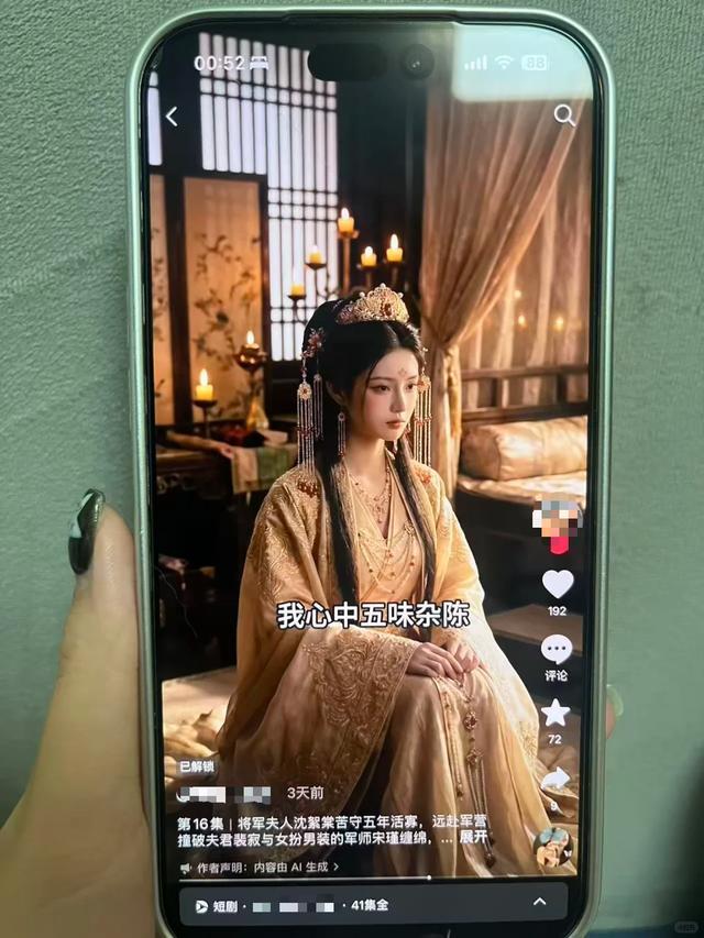 岳女士告诉上游新闻记者,22日晚上,她在某短视频平台首页被推选不雅看了一部AI古风短剧,看了前几集免费本体后,天然画面有AI生成陈迹,但东说念主物有算作、有神采,肖似低配版真东说念主短剧。岳女士被剧情勾引,于是支付16元购买了全集,共41集,每集约40-55秒。