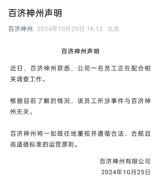 对此,本日下昼,百济神州通过官方公众号发布声明,“公司又名职工正在相助有关走访职责。字据现在了解的情况,该职工所涉事件与百济神州无关。百济神州将一如既往地深爱并解任正当、合规且高谈德尺度的运营原则。”